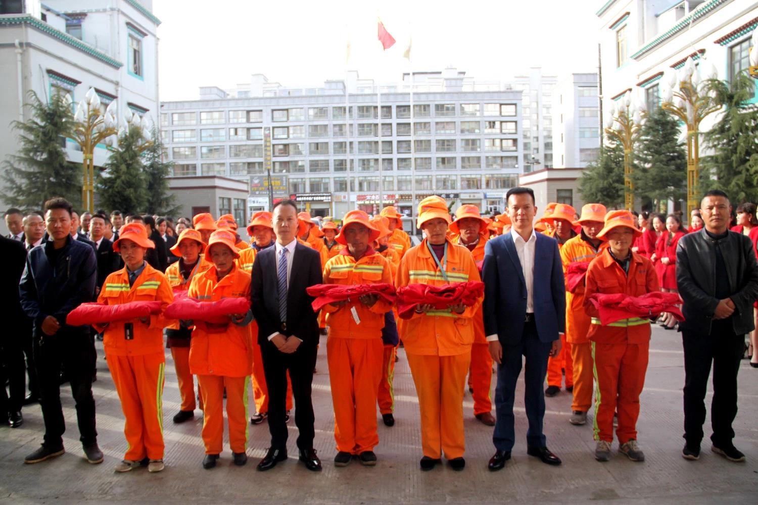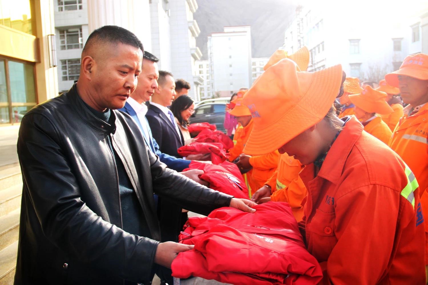 乃東區(qū)副區(qū)長格桑羅布、乃東區(qū)住房和城鄉(xiāng)建設局局長張俊、國策公司負責人次仁旺慶應邀參加活動,并共同為環(huán)衛(wèi)工人發(fā)放了保暖御寒的嶄新環(huán)衛(wèi)工裝。
