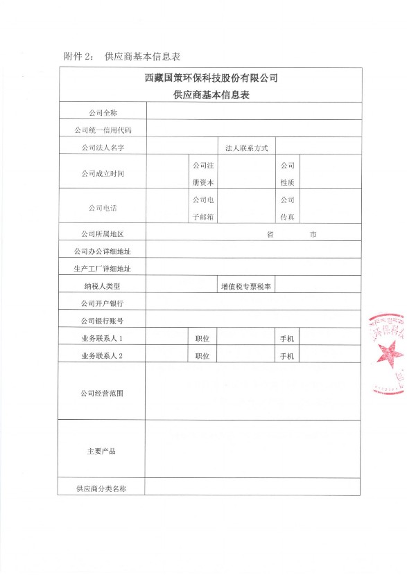 供應商將資料整理成冊并每頁蓋章后掃描為PDF文件,發(fā)送至西藏國策環(huán)??萍脊煞萦邢薰静少忇]箱:cg@guoce.com。