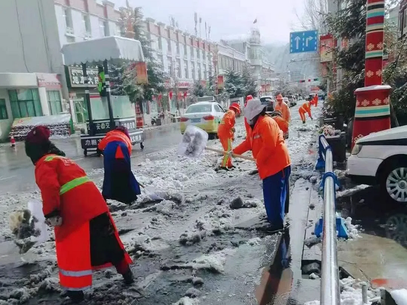 3月14日清晨,日喀則市迎來(lái)了2021年的第一場(chǎng)降雪,久違的雪花在給市民們帶來(lái)欣喜的同時(shí),也考驗(yàn)著國(guó)策環(huán)保日喀則分公司一線環(huán)衛(wèi)人們清積雪、防結(jié)冰的保障能力。